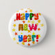 A New Year's Button or Badge with 'Happy New Year' in multicoloured letters and orange and yellow starts scattered all over the white background. From a handpainted paper collage design by Judy Adamson.
