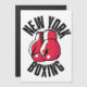 The image features a pair of red boxing gloves, positioned in a classic fighting stance, with the words "NEW YORK BOXING" in bold black lettering surrounding them. The gloves are detailed with white accents and yellow laces, adding a touch of realism to the design. The background is a simple white, allowing the vibrant red of the gloves and the bold black text to stand out.