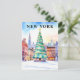 A festive illustration postcard of New York City during Christmas, featuring a decorated holiday tree with the snowy skyline in the background. A perfect USA winter travel souvenir.