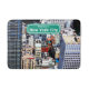 New York City bathmat featuring a colourful photography of the artistical architectur of the city, the typical green and white city sign and the customisable text "Welcome to New York City".