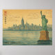 Vintage New York City skyline and the Statue of Liberty in Japanese Ukiyo-e art style. Retro aesthetic with kanji details and textured paper finish.