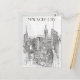 This travel postcard, in hand drawn sketch-style, showcases a sketch of the skyline of New York City's Manhattan district.