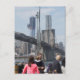 The Brooklyn Bridge, Freedom Tower, and tallest residential buildings in the Americas rise across the East River in Manhattan, distorted by the glass enclosure of the carousel located in DUMBO, Brooklyn.
