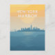 Smooth graphic illustration of the New York City skyline and harbor at sunset. Features the Empire State Building and a bridge silhouette over calm water.