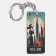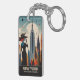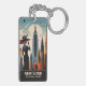 Experience the excitement of "New York: Land of Endless Possibilities" with this striking travel keychain! This captivating travel keychain showcases a silhouetted woman in a stylish hat, set against a retro-futuristic skyline filled with iconic skyscrapers. A large moon and celestial bodies add a cosmic flair, enhancing the scene's allure. With the tagline "New York: Land of Endless Possibilities," this artwork beautifully captures the essence of adventure and opportunity that defines the Empire State, inviting dreamers to explore its boundless horizons.