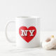 This mug features vibrant red hearts containing the bold, white, upper case letters NY, the official abbreviation for New York, the empire state.