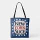 A fun and cute typographic message design that says "New York Slice". It has black and red text on a white rectangle with funky, playful white dots surrounding it, all on a blue background.