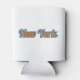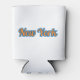 This custom can cooler features a design that displays the word "New York" in a Lobster print font with orange coloured letters blue outline in this custom state pride jersey style theme. Our can coolers fits any standard 12 oz cans and is customised on all sides including the bottom and made with high-density open-cell polyurethane collapsible foam material for easy storage.