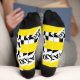 Novelty yellow socks patterned with black and white checkerboards, and taxi signs. Fun gift for taxi drivers.