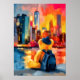 Vibrant New York teddy fauvist artwork featuring a contemplative teddy bear traveler with backpack overlooking the Manhattan skyline and One World Trade Center at sunset. Bold fauvist color planes and structured geometric reflections create striking wall art perfect for NYC lovers, nursery decor, and modern interiors.