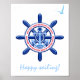 A stylish and charming poster on the theme of traveling around the world by sea. A blue anchor against the background of a dark blue helm or steering wheel. Both are stylized as if they are 3d objects. Two customizable template texts of red color go around the helm. You can change or delete them independently. They are as follows: "ANY TEXT HERE OR DELETE THIS TEXT" on the top part, "NEW YORK * 40°40'04"N 74°02'26"W * UNITED STATES" at the bottom. The third template text "USNYC" is the international seaport code and is located at the bottom of the anchor. The blue text "Happy sailing!" under the image, the image of a seagull at the upper right corner. You are free to change or delete all of them as you please. Type the name of your boat or yacht, for example. You can also change images. Please, use the "Edit Design" or "Personalize" (as the case may be) button of the blue color to get to the "Designer Tool" where you can change everything, including font, color of the background, etc. Just be creative, customize and buy one, enjoy, and be happy!