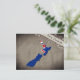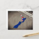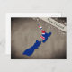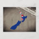 Postcard with an outline of New Zealand, coloured in the design of the national flag.