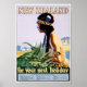 Restored and digitally enhanced vintage travel poster showing a young Maori woman in traditional costume seated in the foreground with a woven flax mat, and thermal steam vents in the distance. Imperfections, dust and hairs removed. Colours corrected.