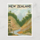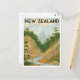 New Zealand postcard with vintage travel poster style with an illustration from an antique postcard circa 1910 and the name New Zealand added in an art deco font. This beautiful vintage illustration from the Queenstown area shows a stream running down between hills with snowcapped mountains in the background.