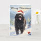 Colourful design of a Newfoundland dog wearing a santa hat walking through the snowy mountains and wishes a merry christmas.