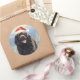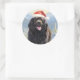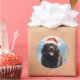 Colourful design of a Newfoundland dog wearing a santa hat walking through the snowy mountains and wishes a merry christmas.