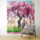 A newly married couple stands beneath a large, stunning tree adorned with bright pink flowers. The petals have gently fallen, creating a picturesque path of blossoms, forming a beautiful walkway for the newlyweds.