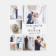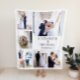 A custom keepsake blanket for newlyweds featuring a 9 photo collage of your wedding day, honeymoon, engagement, etc., and your names and wedding date in elegant serif typography. The background colour can be changed by editing in the design tool.