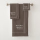 Stylish Mr and Mrs personalised towel set for the newlywed bride and groom in brown and white with editable script, name and established wedding date