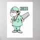 A cartoon drawing of a surgeon holding a large hand saw behind his back shouting "NEXT!"