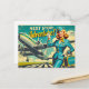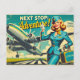 Here’s the vintage travel postcard featuring a glamourous 1960s flight attendant with a stylish blue uniform, matching hat, and white gloves. ✈️🌍👩✈️ She holds a carry-on bag and gestures towards a sleek aeroplane. The background features a clear blue sky with fluffy clouds and a runway. The bold 1960s-style typography reads "Next stop: Adventure!", giving it a nostalgic, aviation-inspired vibe.