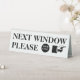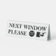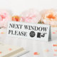 Ideal for any business or supermarket chain that serves customers using tellers. A white background has a bold black font on it that says "Next window please" with the silhouette of a hand pointing a finger in the direction to go. Personalise the wording to any of your choice and feel free to add a background colour and to change the colour, style and size of the font to suit your business requirements.