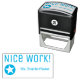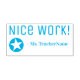 This positive rubber stamp design features the message "Nice Work!" and a custom teacher name. It also features a decorative star shape. It could be used by a teacher, educator, instructor, or tutor when grading student work, to indicate that a student has done an exceptional job.