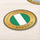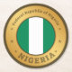 The national flag of Nigeria is encapsulated in a faux gold ring shape. Around the outer of the ring, are two parts of text with the official name of Nigeria and the country name.