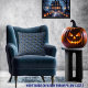 This digitalised, graphic drawing, depicts a ghostly, gnarled-looking tree, with claw-shaped, limbs, stretched out towards, a shadowy, bronze-coloured, moon-with Raven birds, perched, amongst the branches, displayed with Gothic greeting, against a blue, and midnight-blue, sky.