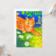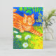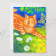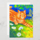 Card featuring Louis Wain’s animal painting Cat Stalking (1860-1939). An orange striped cat walks a green field at night. White, purple, and red flowers are in the foreground. A wonderful gift for cat lovers and English art.