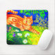 Mouse Pad featuring Louis Wain’s animal painting Cat Stalking (1860-1939). An orange striped cat walks a green field at night. White, purple, and red flowers are in the foreground. A wonderful gift for cat lovers and English art.