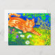 Postcard featuring Louis Wain’s animal painting Cat Stalking (1860-1939). An orange striped cat walks a green field at night. White, purple, and red flowers are in the foreground. A wonderful gift for cat lovers and English art.