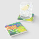 Stone Coaster featuring Louis Wain’s animal painting Cat Stalking (1860-1939). An orange striped cat walks a green field at night. White, purple, and red flowers are in the foreground. A wonderful gift for cat lovers and English art.