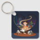 An illustration of a cozy creative evening: a woman drawing with a pen, coffee, and a sleeping cat, viewed through a heart-shaped window overlooking a city skyline.