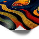 A.I .created print of a variety of vibrant fish with intricate patterns swim at night through swirling currents of blue ocean waters as waving seaweed and bright circular bubbles float upward from the seabed.