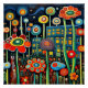 A.I .created print of surreal, vibrant, oversized flowers with swirling patterns stand tall on in garden landscape against a backdrop of a brightly lit building at night.