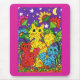 These three colourful cats are sitting in a vibrant garden in the middle of the night, surrounded by small multicolored flowers on the ground and tall vivid flowers above them. Fireflies buzz and a crescent moon shines overhead in a star-filled purple sky.