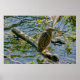 A photograph of an immature Night Heron bird standing on a log in a river. Other branches and logs can be seen floating and submerged in the water. Aquatic plants protrude from the water, and tree leaves frame the scene. The ripples in the water show the movement of the river. Image Copyright ©2021 Kimberly J Tilley.