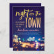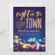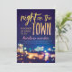 Typography bachelorette party invitation with Night on the Town written over a blurred photo of a city at night.