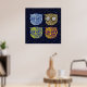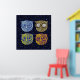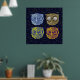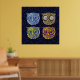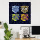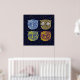 Four graphic owl illustrations in a starry deep blue sky to decor your home walls