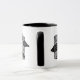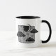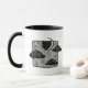 Black and white mug with magic night graphic illustration. Half moon, clouds and stars ink drawing.