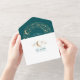 This fabulous teal and gold wedding invitation brings the romantic allure of a starry night sky to life through its unique celestial arch design. It perfectly reflects the love and magic of your big day. The all-in-one format integrates the main invitation with a detachable RSVP card, ensuring a smooth experience for your guests. With its elegant and compact design, this invitation combines simplicity with a touch of luxury, adorned with celestial elements like crescent moons, shooting stars, twinkling stars, roaming planets, intricate constellations, and distant galaxies. Ideal for celestial-themed weddings such as "Under the Stars," "Written in the Stars," or "To the Moon and Back."