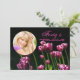 A dramatic invitation featuring hot pink tulips with white tips and a circular photo window for your favourite photo against a black background.