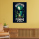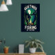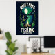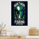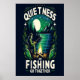 A graphic illustration depicting a man fishing at night with a full moon in the sky. The text reads Quietness and Fishing Go Together.