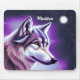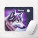 This beautiful mouse pad features an illustration of a mystical wolf face in profile with white and shades of purple and blue. The name on the mouse pad can be customized for the recipient.