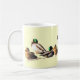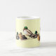 Nine mallard ducks decorate this lovely mug. The males have iridescent green heads, mostly white bodies and yellow beaks. The female's feathers are shades of brown and gold with orange beaks. Set on a creamy background with a green border that matches the male plumage, this is a striking design!