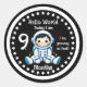 The image features an adorable, cartoon-style illustration of a child dressed in a white and blue astronaut suit. The child is seated with legs spread out and hands resting on the ground. The suit includes a helmet with a clear visor, blue accents, and buttons on the chest area. The black background makes the character stand out prominently. This charming depiction combines the innocence of a child with the adventurous theme of space travel, creating an engaging and delightful visual.