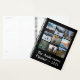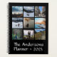 This custom yearly planner features solid colour background with a nine photo grid layout, family name, and the year on the front cover. Includes monthly overview, weekly plans, and comes with a page of planner stickers. Available in two sizes, glossy softcover or satin-matte hardcover, and your choice of wire spiral spine colour in white, black, or gold.