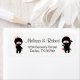 Adorable little ninja boy dressed in black is blushing shyly while holding an origami paper heart behind his back and looking at a cute ninja girl, also dressed in black but for a pink bow on top of her head. Girl’s katana sword handle is also coloured pink.