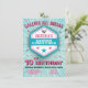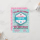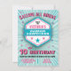 Poster style Ninja Warrior birthday party invitation with shield, stars, sunburst background with aqua, pink and white colours for a girl.